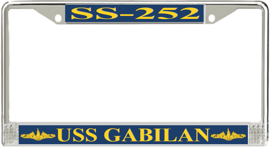 USS Gabilan SS-252 License Plate Frame This USS Gabilan SS-252 License Plate Frame is proudly made in the USA at our facilities in Scottsboro, Alabama. Each Frame features top and bottom sublimated design strips that are poly coated for a protective gloss finish. Please check your state and local regulations for compatibility of these frames for use on your vehicle.