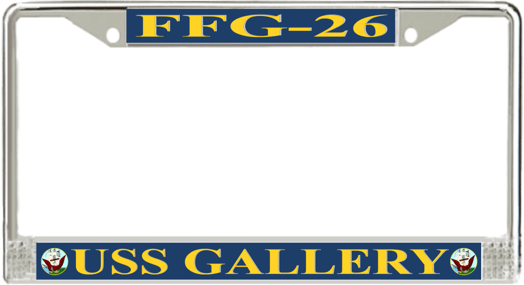 USS Gallery FFG-26 License Plate FrameThis USS Gallery FFG-26 License Plate Frame is proudly made in the USA at our facilities in Scottsboro, Alabama. Each of our MilitaryBest U.S. Navy Frames feature top and bottom Poly Coated Aluminum strips that are printed using sublimation which gives these quality automobile military frames a beautiful high gloss finish.