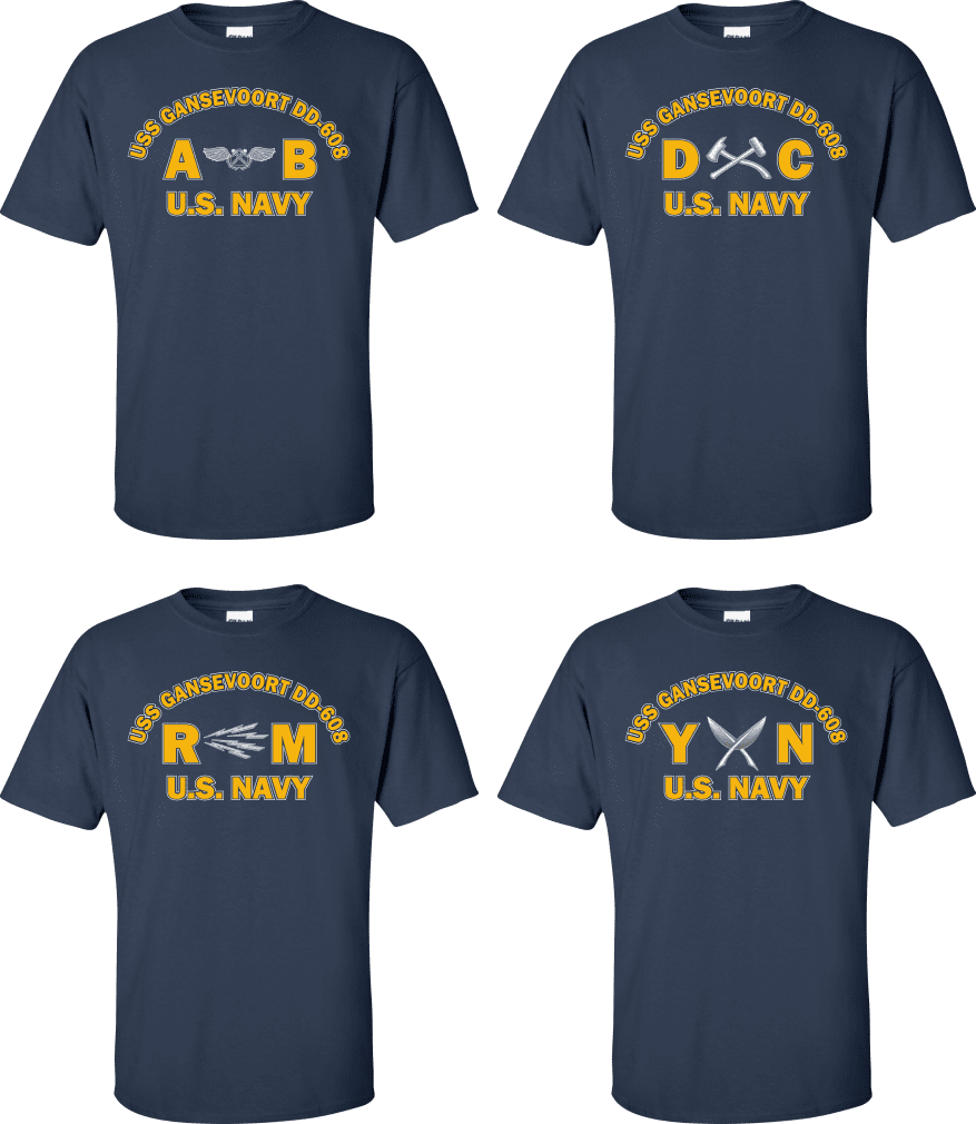 Due to disruptions in supply chains, this design will be embroidered on a Champion, Gildan, Jerzees or comparable brand.Proudly display your ship and rate with our top quality USS GANSEVOORT DD-608 Rates t-shirts, sweatshirts, and hoodies. These fine U.S. Navy apparel items will make you the envy of your veteran buddies, or will make a fine gift! Our USS GANSEVOORT DD-608 shirts are proudly printed in the USA!