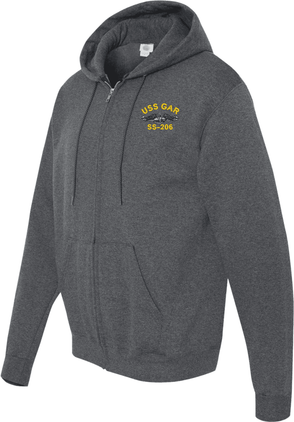 MilitaryBest has expanded its line of apparel with this custom embroidered USS Gar SS-206 with Dolphins Embroidered Zippered Hoodie. Each Hoodie is direct embroidered onto a Champion brand 9.5 oz 50/50 Cotton Poly blend. This will make an excellent addition to your wardrobe, or a great gift. Your satisfaction is Guaranteed! These quality zippered hoodies are proudly embroidered at our facilities in Scottsboro, AL. Support the Army MWR program by purchasing only from Licensed Vendors.