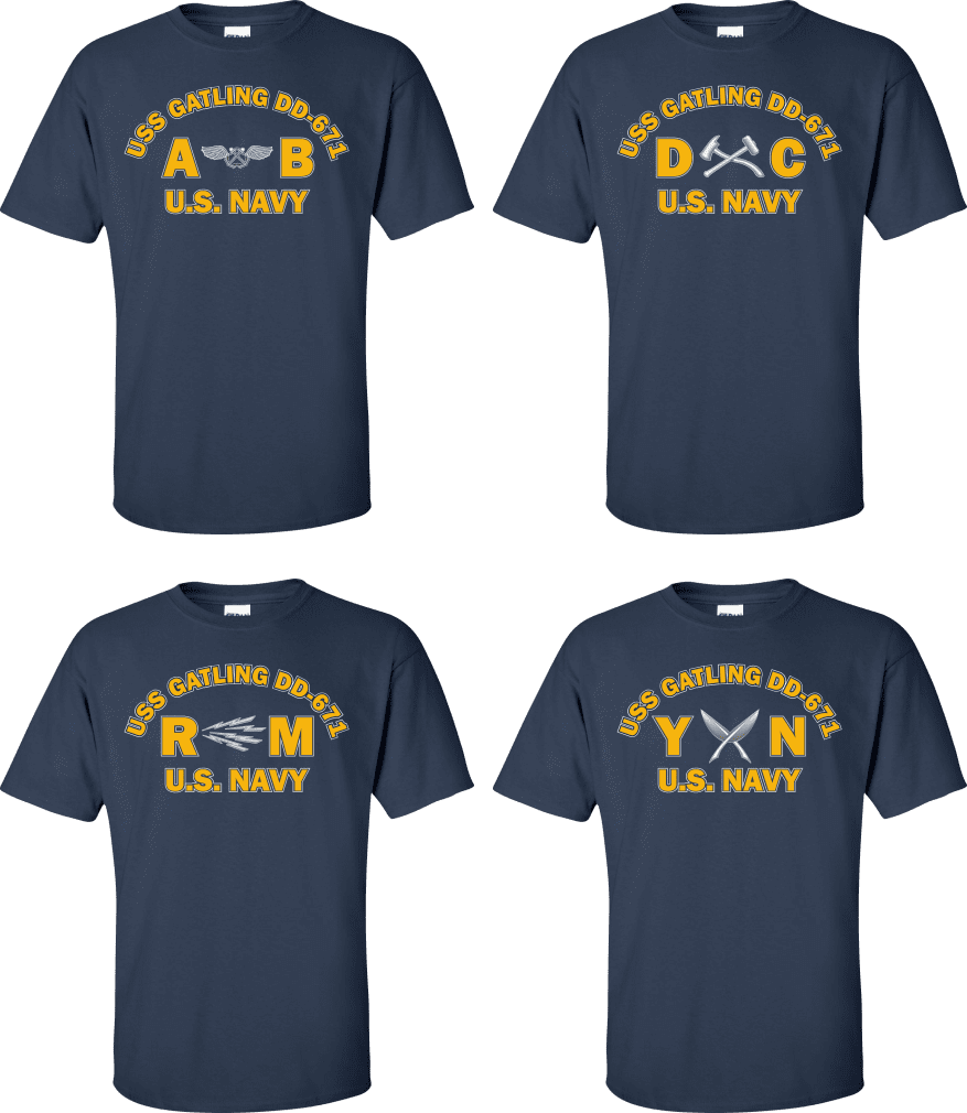 Due to disruptions in supply chains, this design will be embroidered on a Champion, Gildan, Jerzees or comparable brand.Proudly display your ship and rate with our top quality USS GATLING DD-671 Rates t-shirts, sweatshirts, and hoodies. These fine U.S. Navy apparel items will make you the envy of your veteran buddies, or will make a fine gift! Our USS GATLING DD-671 shirts are proudly printed in the USA!