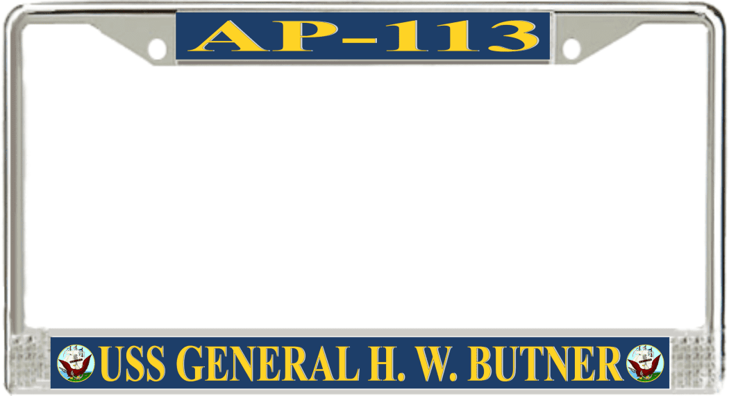 USS General H. W. Butner AP-113 License Plate FrameThis USS General H. W. Butner AP-113 License Plate Frame is proudly made in the USA at our facilities in Scottsboro, Alabama. Each of our MilitaryBest U.S. Navy Frames feature top and bottom Poly Coated Aluminum strips that are printed using sublimation which gives these quality automobile military frames a beautiful high gloss finish.