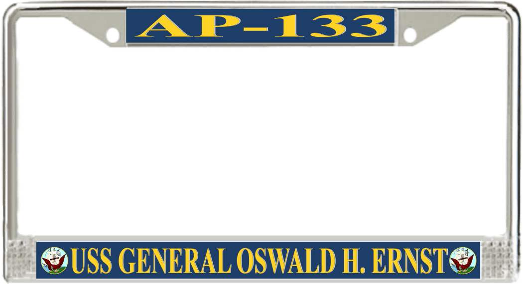 USS General Oswald H. Ernst AP-133 License Plate FrameThis USS General Oswald H. Ernst AP-133 License Plate Frame is proudly made in the USA at our facilities in Scottsboro, Alabama. Each of our MilitaryBest U.S. Navy Frames feature top and bottom Poly Coated Aluminum strips that are printed using sublimation which gives these quality automobile military frames a beautiful high gloss finish.