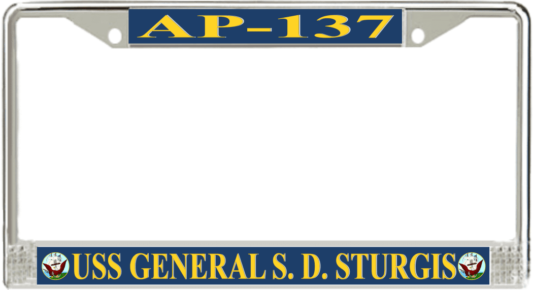 USS General S. D. Sturgis AP-137 License Plate FrameThis USS General S. D. Sturgis AP-137 License Plate Frame is proudly made in the USA at our facilities in Scottsboro, Alabama. Each of our MilitaryBest U.S. Navy Frames feature top and bottom Poly Coated Aluminum strips that are printed using sublimation which gives these quality automobile military frames a beautiful high gloss finish.