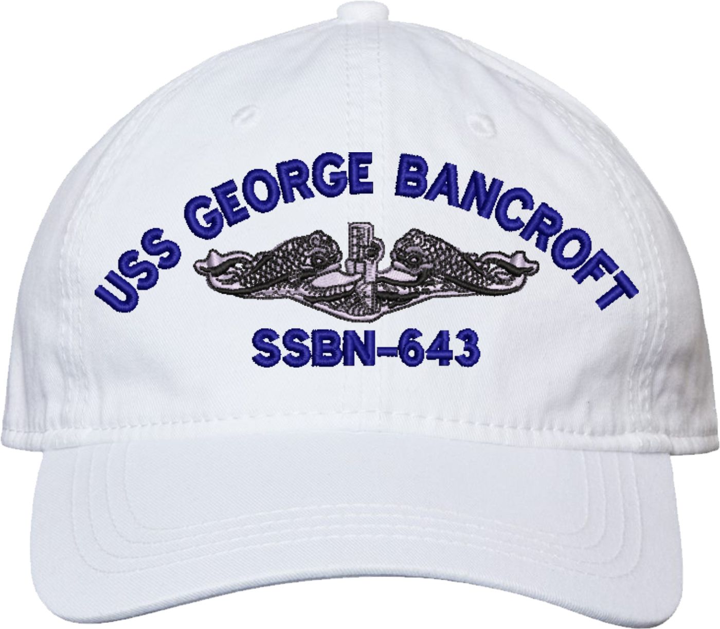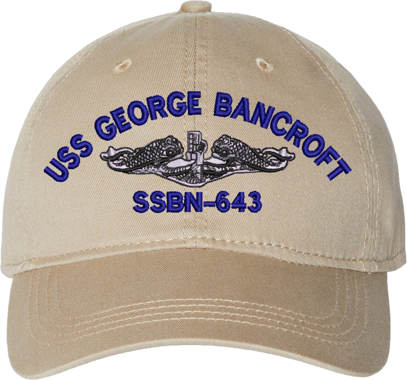 Show your Navy pride with this USS George Bancroft SSBN-643 with Dolphins Unstructured Dad Cap from MilitaryBest. Crafted from 100% washed chino twill cotton, this six-panel, low-profile cap offers a relaxed and comfortable fit. Featuring high-quality embroidery done in our Scottsboro, Alabama facility, this cap is designed with a pre-curved visor and an adjustable tri-glide buckle closure for a perfect fit. Whether for everyday wear or as a meaningful gift, this cap is a great way to honor your own or a loved one's service.For caps ordered with custom embroidered personalized text please allow an additional 3 to 5 days production time. All custom back text will be embroidered in ALL CAPITAL LETTERS. Caps with back text or eggs are non-returnable unless there is a material defect in the cap.