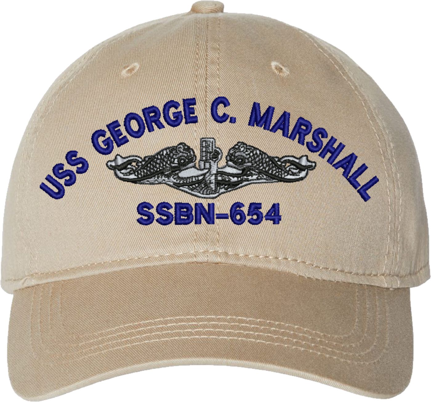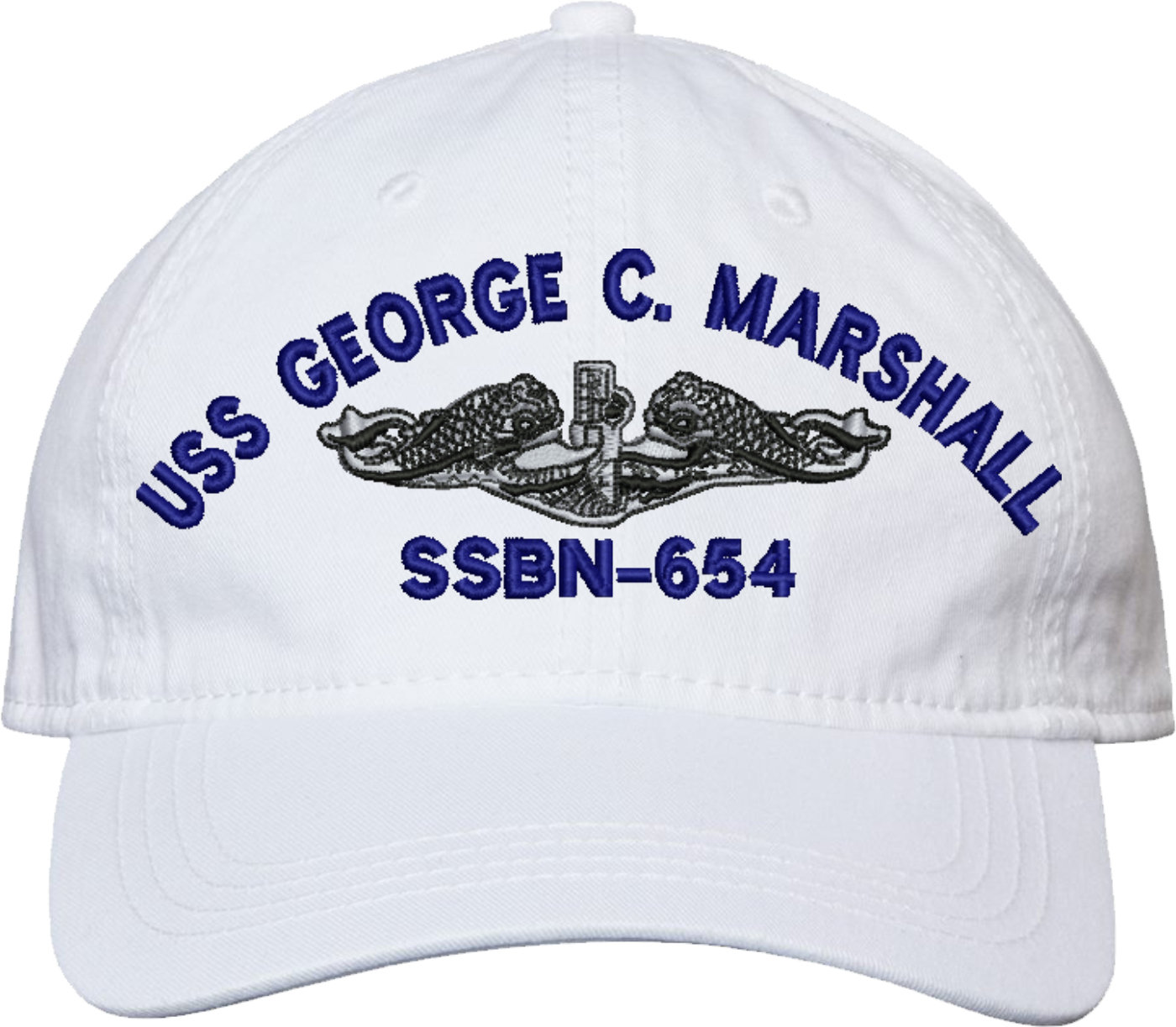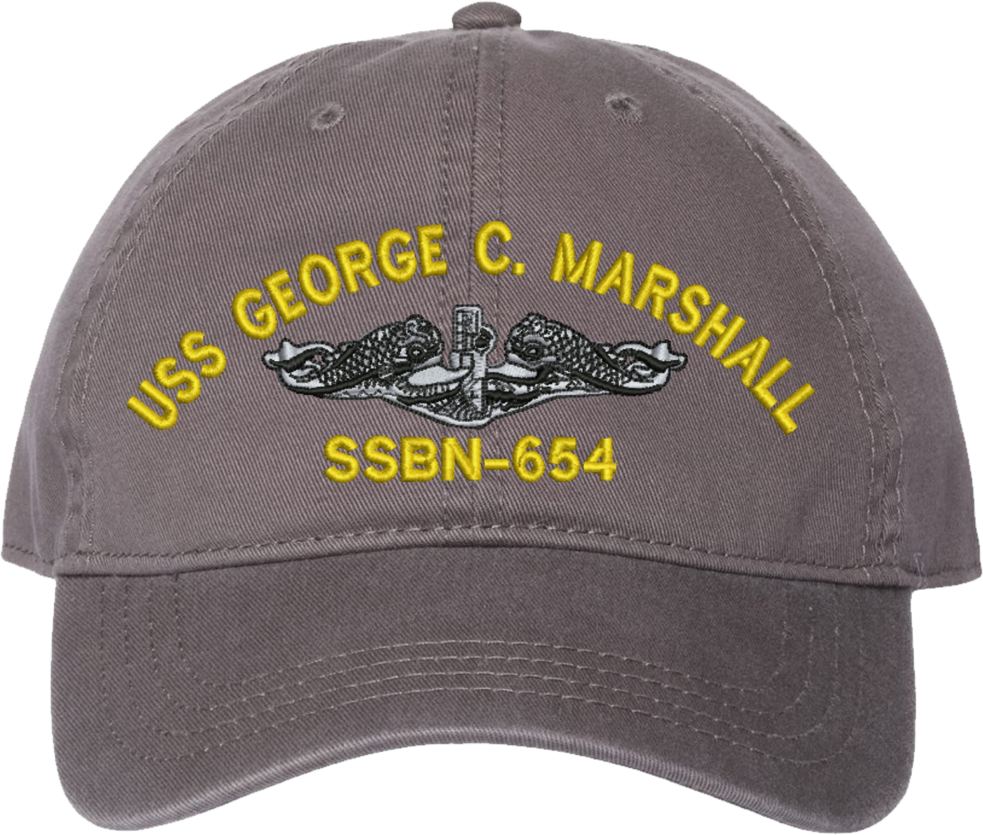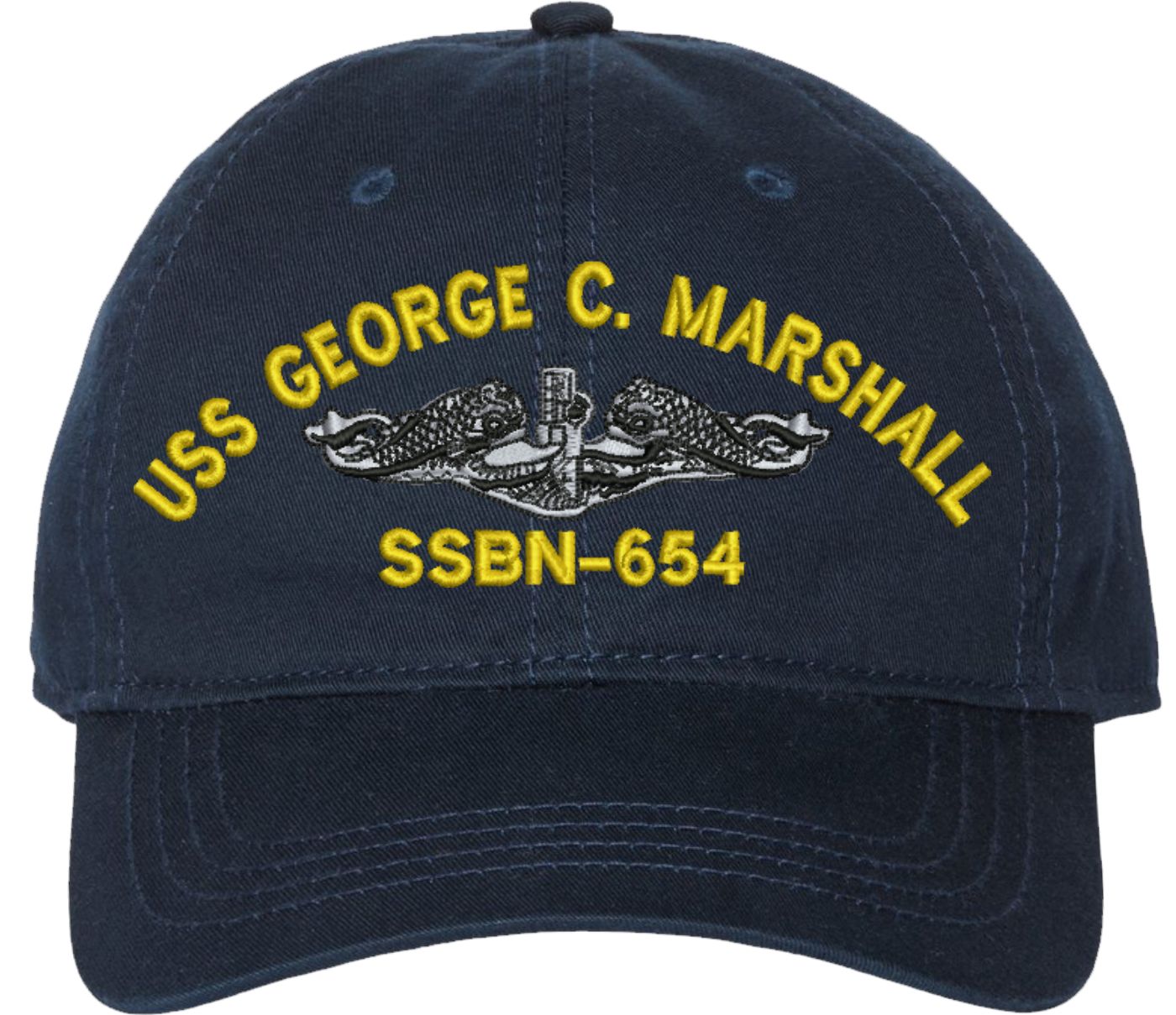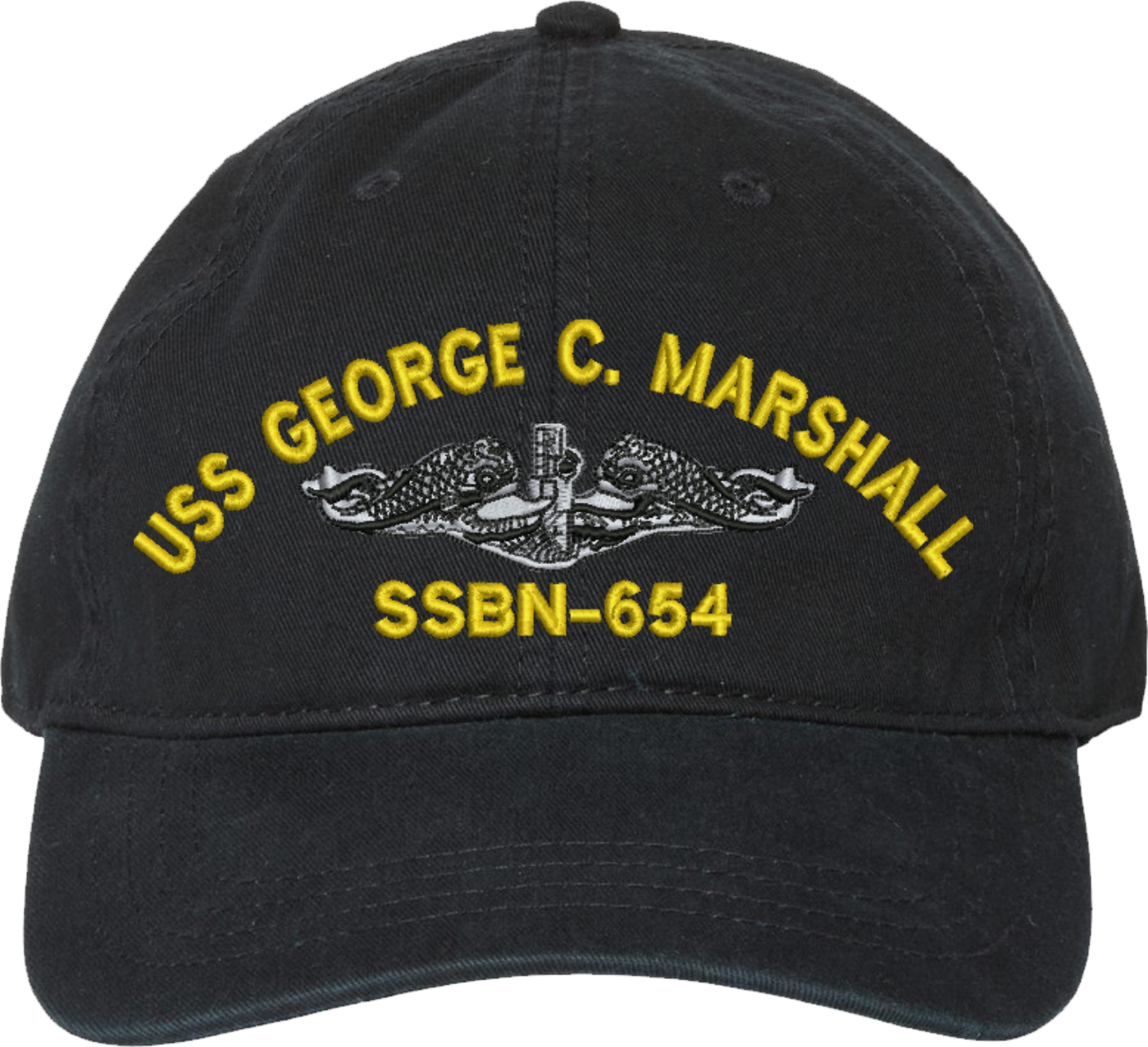 Show your Navy pride with this USS George C Marshall SSBN-654 with Dolphins Unstructured Dad Cap from MilitaryBest. Crafted from 100% washed chino twill cotton, this six-panel, low-profile cap offers a relaxed and comfortable fit. Featuring high-quality embroidery done in our Scottsboro, Alabama facility, this cap is designed with a pre-curved visor and an adjustable tri-glide buckle closure for a perfect fit. Whether for everyday wear or as a meaningful gift, this cap is a great way to honor your own or a loved one's service.For caps ordered with custom embroidered personalized text please allow an additional 3 to 5 days production time. All custom back text will be embroidered in ALL CAPITAL LETTERS. Caps with back text or eggs are non-returnable unless there is a material defect in the cap.