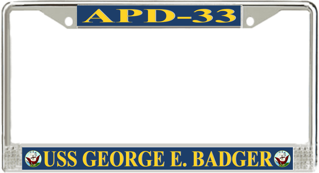 USS George E. Badger APD-33 License Plate FrameThis USS George E. Badger APD-33 License Plate Frame is proudly made in the USA at our facilities in Scottsboro, Alabama. Each of our MilitaryBest U.S. Navy Frames feature top and bottom Poly Coated Aluminum strips that are printed using sublimation which gives these quality automobile military frames a beautiful high gloss finish.