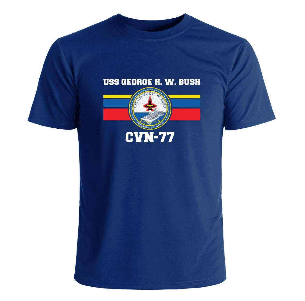 MilitaryBest is proud to offer this U.S. Navy Aircraft Carrier Crest T-Shirt. Each design is offered in Navy Blue. This fine USS George H. W. Bush CVN-77 Crest T-Shirt is proudly printed in the USA. The quality of all of our Military products is guaranteed. Unless there is a defect in workmanship or material, these shirts are unreturnable.A percentage of the sale of each MilitaryBest item is forwarded to the licensing departments of each respective branch of service in support of the MWR (Morale, Welfare, & Recreation) program. These payments are made by either ALL4U LLC or the wholesaler from where the item originated. Our team thanks you for your service and your support of these programs.