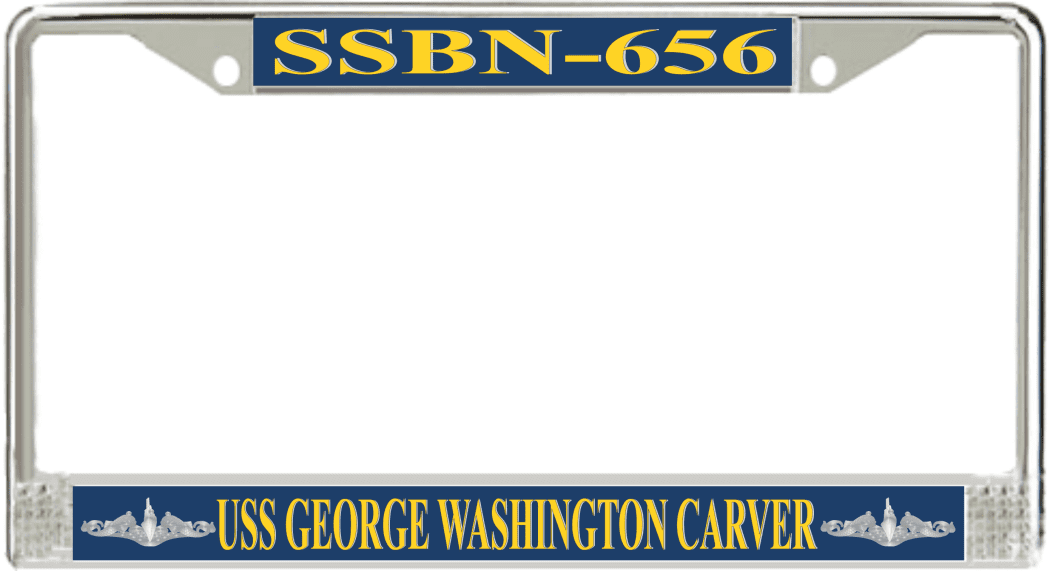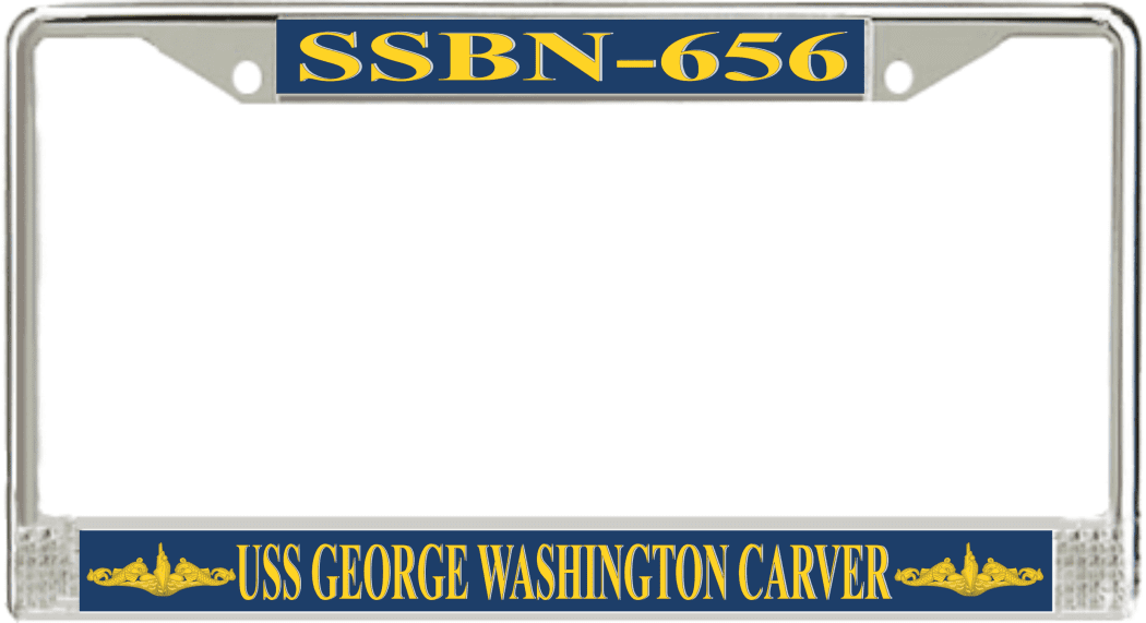 USS George Washington Carver SSBN-656 License Plate Frame This USS George Washington Carver SSBN-656 License Plate Frame is proudly made in the USA at our facilities in Scottsboro, Alabama. Each Frame features top and bottom sublimated design strips that are poly coated for a protective gloss finish. Please check your state and local regulations for compatibility of these frames for use on your vehicle.