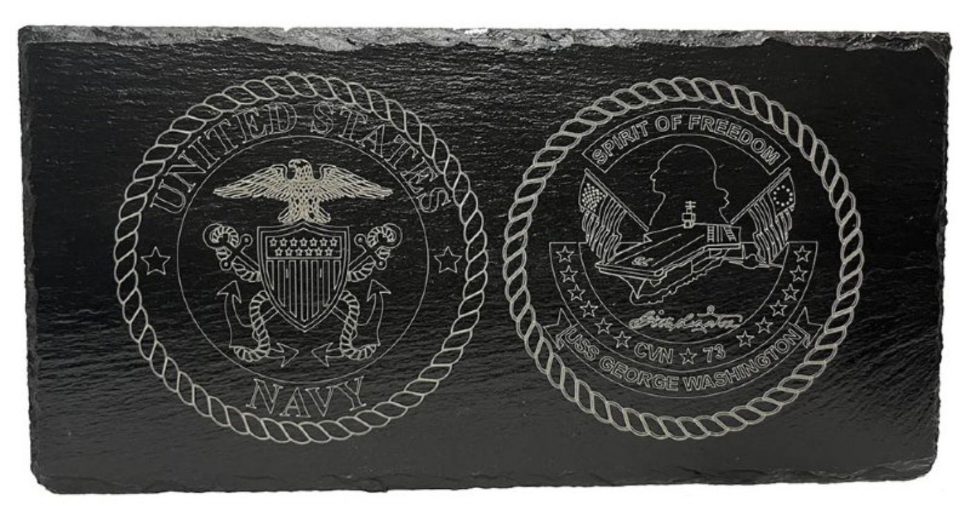 We are proud to offer this laser engraved slate plaque. This USS George Washington CVN-73 Enlisted Plaque is engraved on a 12 x 6 inch piece of slate that offers a rustic and classic way to display on your desktop or book shelf. All plaques come with a black metal three leg stand. This plaque is Offically Licensed product by the Navy and made in the USA.