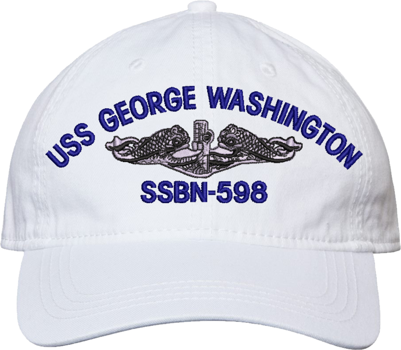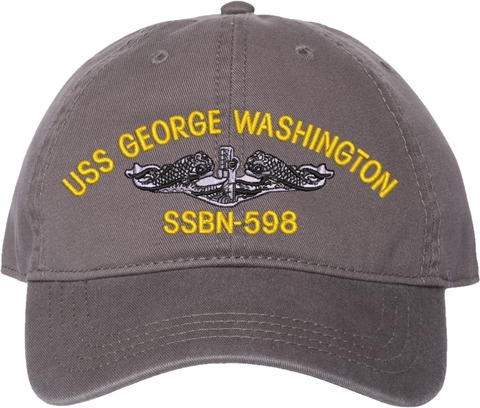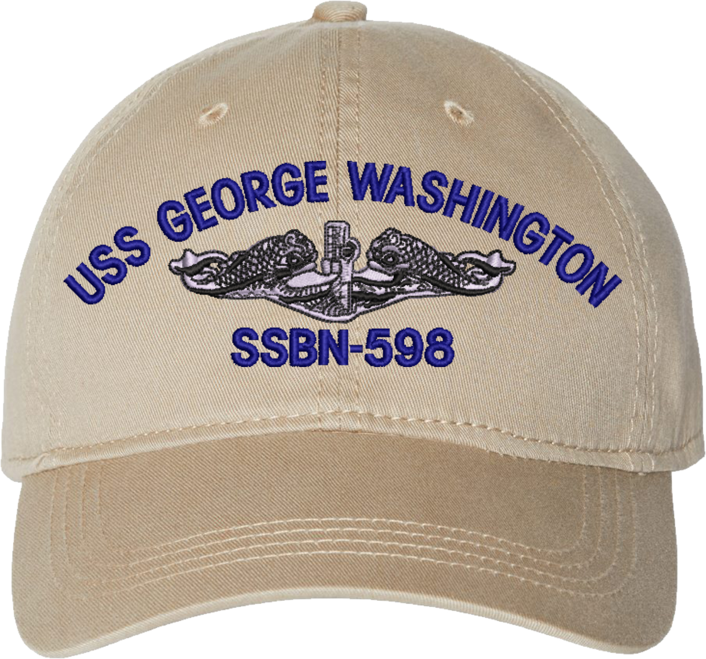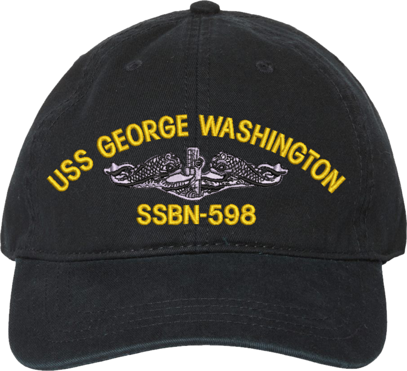 Show your Navy pride with this USS George Washington SSBN-598 with Dolphins Unstructured Dad Cap from MilitaryBest. Crafted from 100% washed chino twill cotton, this six-panel, low-profile cap offers a relaxed and comfortable fit. Featuring high-quality embroidery done in our Scottsboro, Alabama facility, this cap is designed with a pre-curved visor and an adjustable tri-glide buckle closure for a perfect fit. Whether for everyday wear or as a meaningful gift, this cap is a great way to honor your own or a loved one's service.For caps ordered with custom embroidered personalized text please allow an additional 3 to 5 days production time. All custom back text will be embroidered in ALL CAPITAL LETTERS. Caps with back text or eggs are non-returnable unless there is a material defect in the cap.