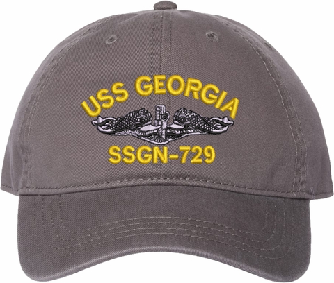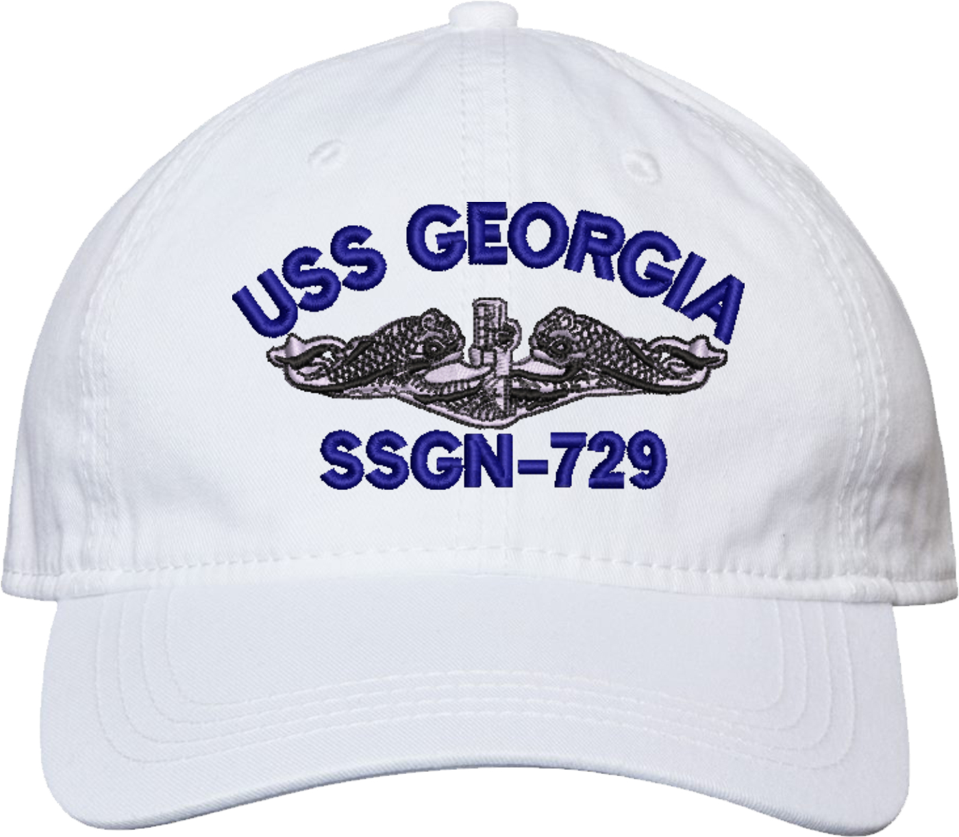 Show your Navy pride with this USS Georgia SSGN-729 with Dolphins Unstructured Dad Cap from MilitaryBest. Crafted from 100% washed chino twill cotton, this six-panel, low-profile cap offers a relaxed and comfortable fit. Featuring high-quality embroidery done in our Scottsboro, Alabama facility, this cap is designed with a pre-curved visor and an adjustable tri-glide buckle closure for a perfect fit. Whether for everyday wear or as a meaningful gift, this cap is a great way to honor your own or a loved one's service.For caps ordered with custom embroidered personalized text please allow an additional 3 to 5 days production time. All custom back text will be embroidered in ALL CAPITAL LETTERS. Caps with back text or eggs are non-returnable unless there is a material defect in the cap.
