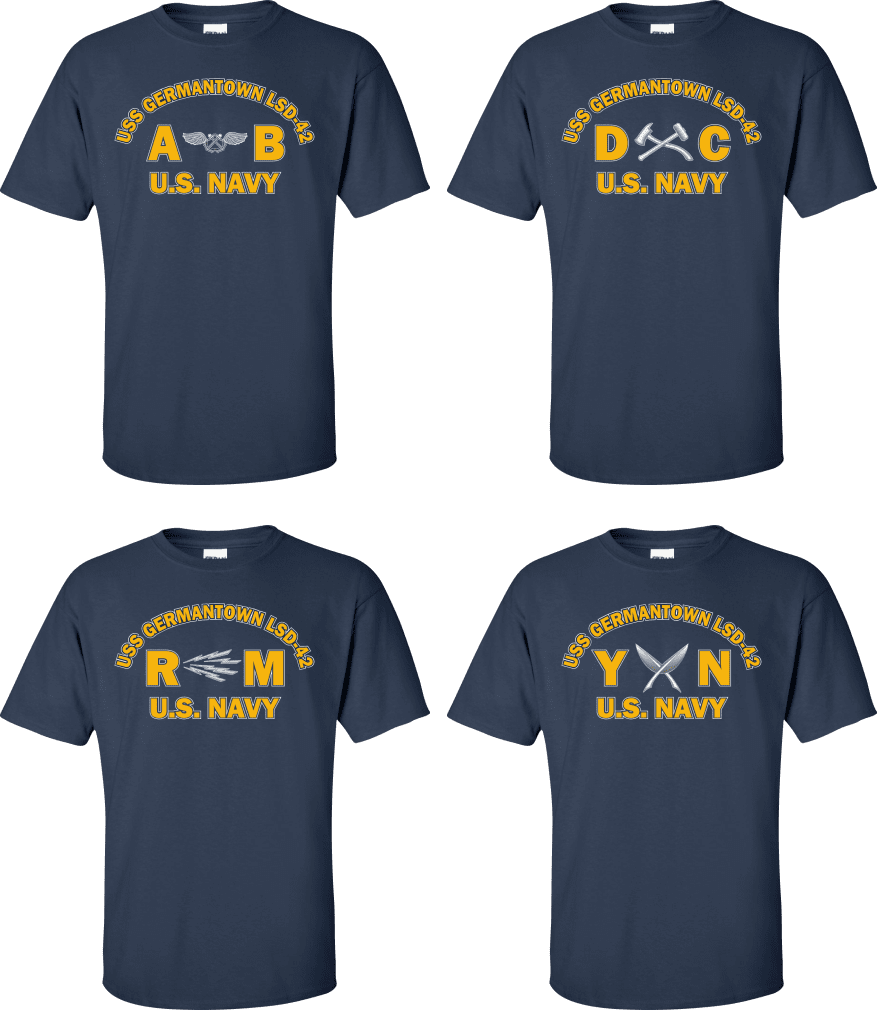 Due to disruptions in supply chains, this design will be embroidered on a Champion, Gildan, Jerzees or comparable brand.Proudly display your ship and rate with our top quality USS GERMANTOWN LSD-42 Rates t-shirts, sweatshirts, and hoodies. These fine U.S. Navy apparel items will make you the envy of your veteran buddies, or will make a fine gift! Our USS GERMANTOWN LSD-42 shirts are proudly printed in the USA!
