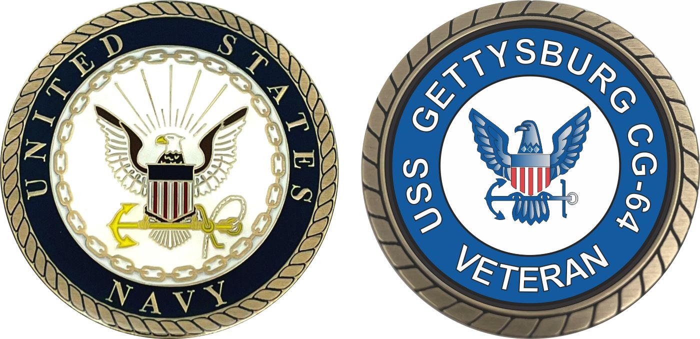 This 1 3/4 USS Gettysburg LSD-64 Veteran Challenge Coin is proudly offered by MilitaryBest. This Officially Licensed Navy coin has beautiful enamel finish on one side and an organized crisp clean USS Gettysburg LSD-64 Veteran design on the opposite side.