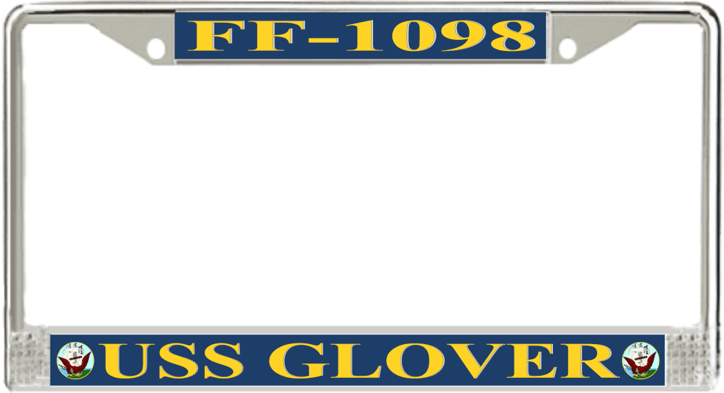 USS Glover FF-1098 License Plate FrameThis USS Glover FF-1098 License Plate Frame is proudly made in the USA at our facilities in Scottsboro, Alabama. Each of our MilitaryBest U.S. Navy Frames feature top and bottom Poly Coated Aluminum strips that are printed using sublimation which gives these quality automobile military frames a beautiful high gloss finish.