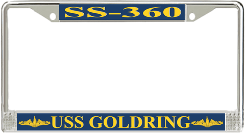 USS Goldring SS-360 License Plate Frame This USS Goldring SS-360 License Plate Frame is proudly made in the USA at our facilities in Scottsboro, Alabama. Each Frame features top and bottom sublimated design strips that are poly coated for a protective gloss finish. Please check your state and local regulations for compatibility of these frames for use on your vehicle.
