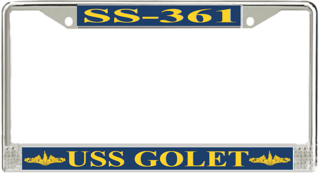 USS Golet SS-361 License Plate Frame This USS Golet SS-361 License Plate Frame is proudly made in the USA at our facilities in Scottsboro, Alabama. Each Frame features top and bottom sublimated design strips that are poly coated for a protective gloss finish. Please check your state and local regulations for compatibility of these frames for use on your vehicle.