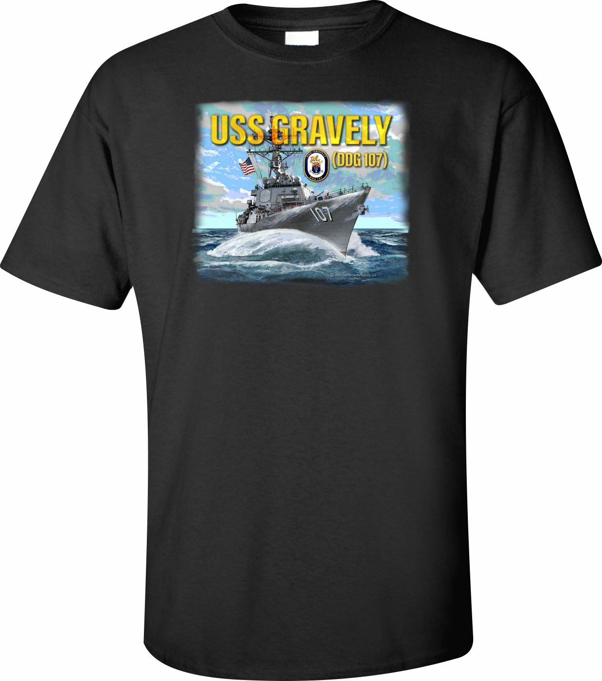 MilitaryBest is proud to offer this fine USS Gravely DDG-107 Printed Art T-Shirt. This shirt features a full front print, with beautiful artwork designed by licensed Navy artist David Hart. This shirt is available in black and navy blue colors. Each T-shirt is proudly printed in the USA.Unless there is a defect in workmanship or material, these shirts are unreturnable.