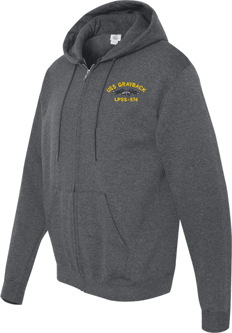 MilitaryBest has expanded its line of apparel with this custom embroidered USS Grayback LPSS-574 with Dolphins Embroidered Zippered Hoodie. Each Hoodie is direct embroidered onto a Champion brand 9.5 oz 50/50 Cotton Poly blend. This will make an excellent addition to your wardrobe, or a great gift. Your satisfaction is Guaranteed! These quality zippered hoodies are proudly embroidered at our facilities in Scottsboro, AL. Support the Army MWR program by purchasing only from Licensed Vendors.