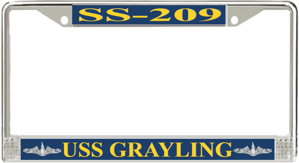 USS Grayling SS-209 License Plate Frame This USS Grayling SS-209 License Plate Frame is proudly made in the USA at our facilities in Scottsboro, Alabama. Each Frame features top and bottom sublimated design strips that are poly coated for a protective gloss finish. Please check your state and local regulations for compatibility of these frames for use on your vehicle.