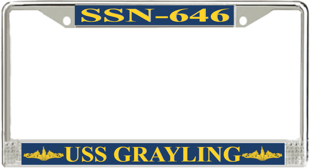 USS Grayling SSN-646 License Plate Frame This USS Grayling SSN-646 License Plate Frame is proudly made in the USA at our facilities in Scottsboro, Alabama. Each Frame features top and bottom sublimated design strips that are poly coated for a protective gloss finish. Please check your state and local regulations for compatibility of these frames for use on your vehicle.