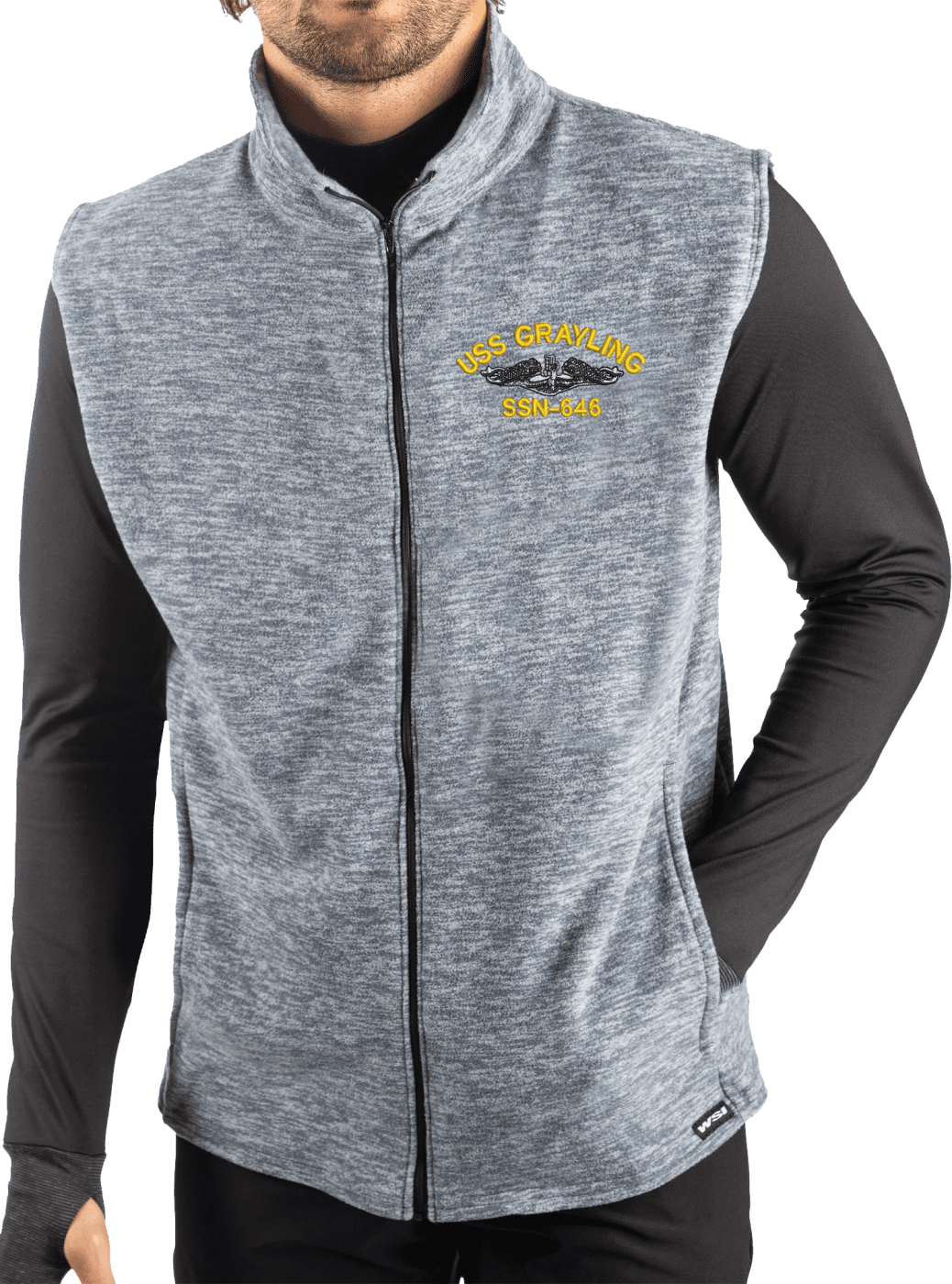 MilitaryBest is proud to offer this USS Grayling SSN-646 with Dolphins Embroidered Polar Fleece Vest. This quality vest is Manufactured by WSI Sportswear in Minnesota and Embroidered by our MilitaryBest team in Northeast Alabama. We remain fully committed to growing our line of 100% Made in the USA products. Each U.S. Air Force Retired Vest is offered in Heather Gray and Heather Blue.PRODUCT FEATURES