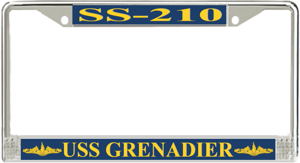 USS Grenadier SS-210 License Plate Frame This USS Grenadier SS-210 License Plate Frame is proudly made in the USA at our facilities in Scottsboro, Alabama. Each Frame features top and bottom sublimated design strips that are poly coated for a protective gloss finish. Please check your state and local regulations for compatibility of these frames for use on your vehicle.