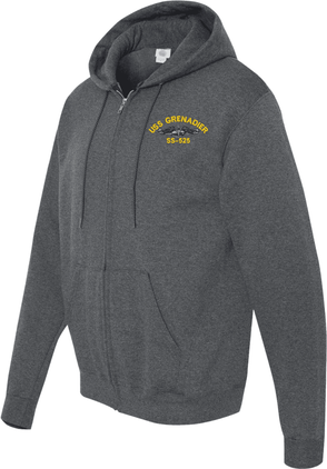 MilitaryBest has expanded its line of apparel with this custom embroidered USS Grenadier SS-525 with Dolphins Embroidered Zippered Hoodie. Each Hoodie is direct embroidered onto a Champion brand 9.5 oz 50/50 Cotton Poly blend. This will make an excellent addition to your wardrobe, or a great gift. Your satisfaction is Guaranteed! These quality zippered hoodies are proudly embroidered at our facilities in Scottsboro, AL. Support the Army MWR program by purchasing only from Licensed Vendors.