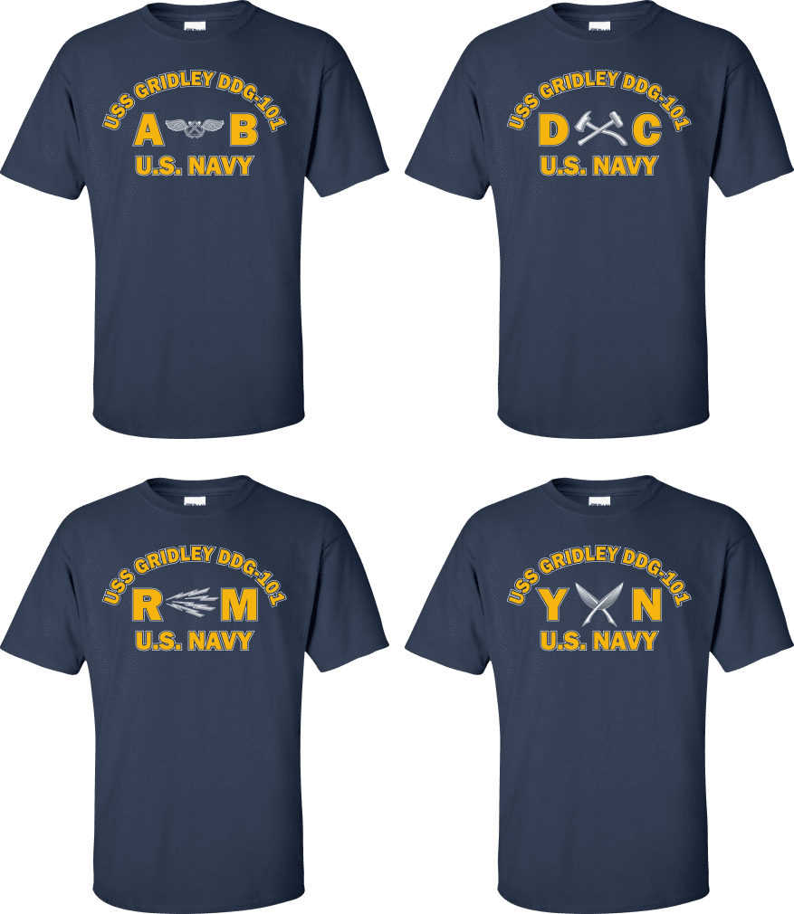 Due to disruptions in supply chains, this design will be embroidered on a Champion, Gildan, Jerzees or comparable brand.Proudly display your ship and rate with our top quality USS GRIDLEY DDG-101 Rates t-shirts, sweatshirts, and hoodies. These fine U.S. Navy apparel items will make you the envy of your veteran buddies, or will make a fine gift! Our USS GRIDLEY DDG-101 shirts are proudly printed in the USA!