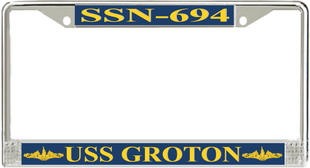 USS Groton SSN-694 License Plate Frame This USS Groton SSN-694 License Plate Frame is proudly made in the USA at our facilities in Scottsboro, Alabama. Each Frame features top and bottom sublimated design strips that are poly coated for a protective gloss finish. Please check your state and local regulations for compatibility of these frames for use on your vehicle.
