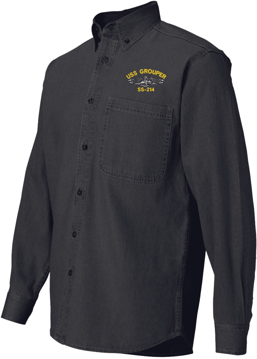 Militarybest is proud to offer this custom embroidered USS Grouper SS-214 with Dolphins Embroidered Denim Shirt. Each Shirt is embroidered with high quality Rapos thread utilizing our in house "Happy Brand" Embroidering Machines.