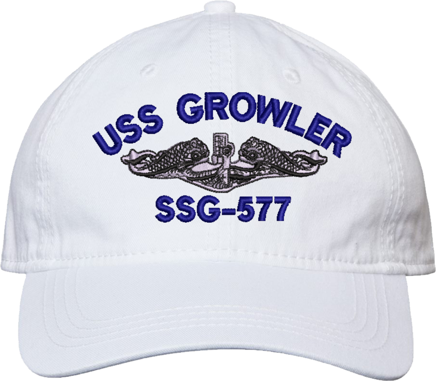 Show your Navy pride with this USS Growler SSG-577 with Dolphins Unstructured Dad Cap from MilitaryBest. Crafted from 100% washed chino twill cotton, this six-panel, low-profile cap offers a relaxed and comfortable fit. Featuring high-quality embroidery done in our Scottsboro, Alabama facility, this cap is designed with a pre-curved visor and an adjustable tri-glide buckle closure for a perfect fit. Whether for everyday wear or as a meaningful gift, this cap is a great way to honor your own or a loved one's service.For caps ordered with custom embroidered personalized text please allow an additional 3 to 5 days production time. All custom back text will be embroidered in ALL CAPITAL LETTERS. Caps with back text or eggs are non-returnable unless there is a material defect in the cap.