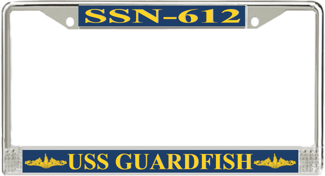 USS Guardfish SSN-612 License Plate Frame This USS Guardfish SSN-612 License Plate Frame is proudly made in the USA at our facilities in Scottsboro, Alabama. Each Frame features top and bottom sublimated design strips that are poly coated for a protective gloss finish. Please check your state and local regulations for compatibility of these frames for use on your vehicle.