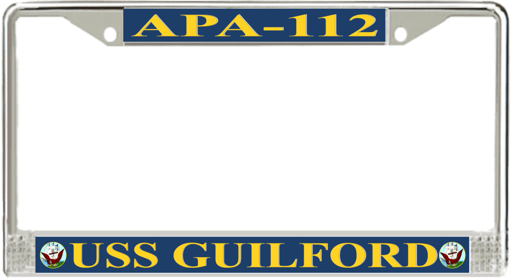 USS Guilford APA-112 License Plate FrameThis USS Guilford APA-112 License Plate Frame is proudly made in the USA at our facilities in Scottsboro, Alabama. Each of our MilitaryBest U.S. Navy Frames feature top and bottom Poly Coated Aluminum strips that are printed using sublimation which gives these quality automobile military frames a beautiful high gloss finish.