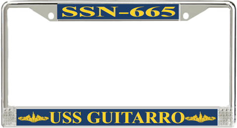 USS Guitarro SSN-665 License Plate Frame This USS Guitarro SSN-665 License Plate Frame is proudly made in the USA at our facilities in Scottsboro, Alabama. Each Frame features top and bottom sublimated design strips that are poly coated for a protective gloss finish. Please check your state and local regulations for compatibility of these frames for use on your vehicle.
