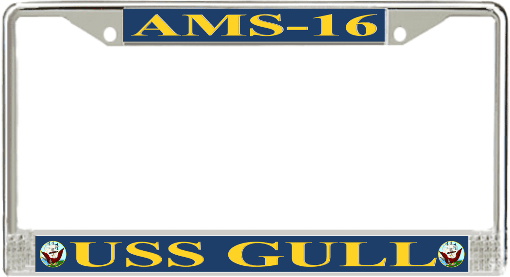 USS Gull AMS-16 License Plate Frame This USS Gull AMS-16 License Plate Frame is proudly made in the USA at our facilities in Scottsboro, Alabama. Each Frame features top and bottom sublimated design strips that are poly coated for a protective gloss finish. Please check your state and local regulations for compatibility of these frames for use on your vehicle.
