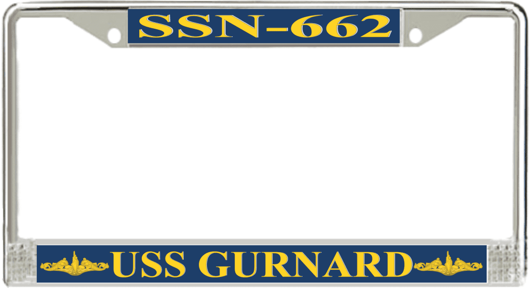 USS Gurnard SSN-662 License Plate Frame This USS Gurnard SSN-662 License Plate Frame is proudly made in the USA at our facilities in Scottsboro, Alabama. Each Frame features top and bottom sublimated design strips that are poly coated for a protective gloss finish. Please check your state and local regulations for compatibility of these frames for use on your vehicle.