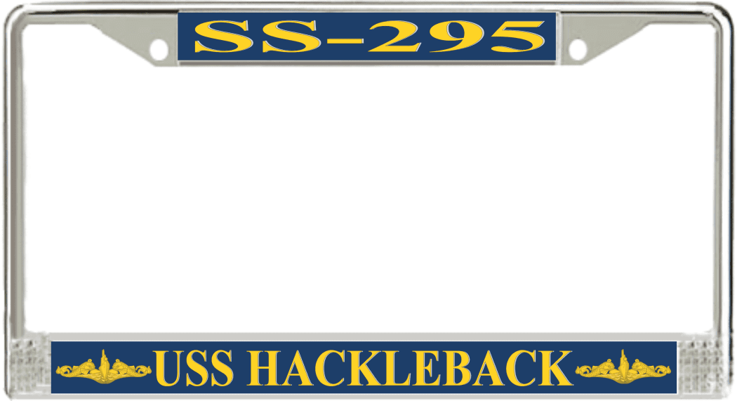 USS Hackleback SS-295 License Plate Frame This USS Hackleback SS-295 License Plate Frame is proudly made in the USA at our facilities in Scottsboro, Alabama. Each Frame features top and bottom sublimated design strips that are poly coated for a protective gloss finish. Please check your state and local regulations for compatibility of these frames for use on your vehicle.