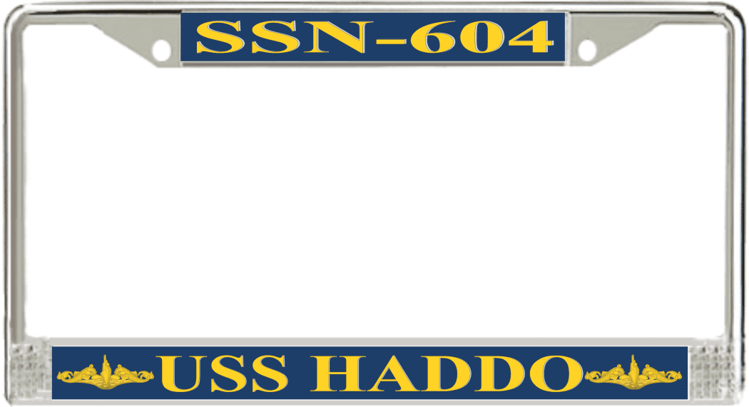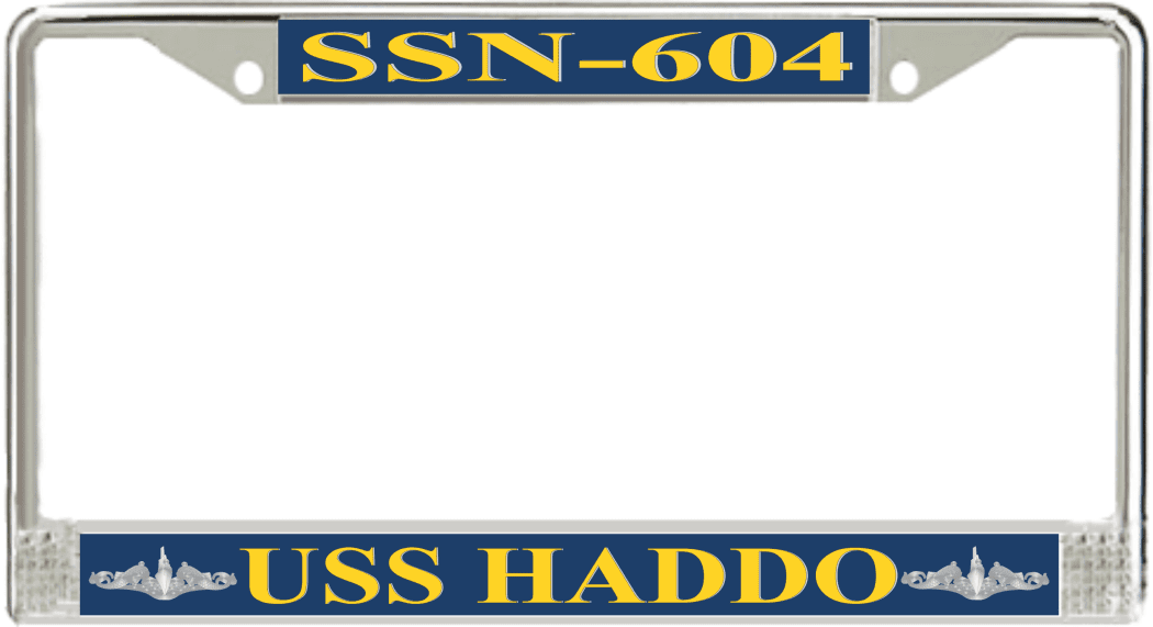 USS Haddo SSN-604 License Plate Frame This USS Haddo SSN-604 License Plate Frame is proudly made in the USA at our facilities in Scottsboro, Alabama. Each Frame features top and bottom sublimated design strips that are poly coated for a protective gloss finish. Please check your state and local regulations for compatibility of these frames for use on your vehicle.