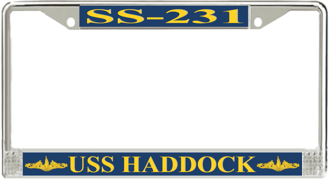USS Haddock SS-231 License Plate Frame This USS Haddock SS-231 License Plate Frame is proudly made in the USA at our facilities in Scottsboro, Alabama. Each Frame features top and bottom sublimated design strips that are poly coated for a protective gloss finish. Please check your state and local regulations for compatibility of these frames for use on your vehicle.