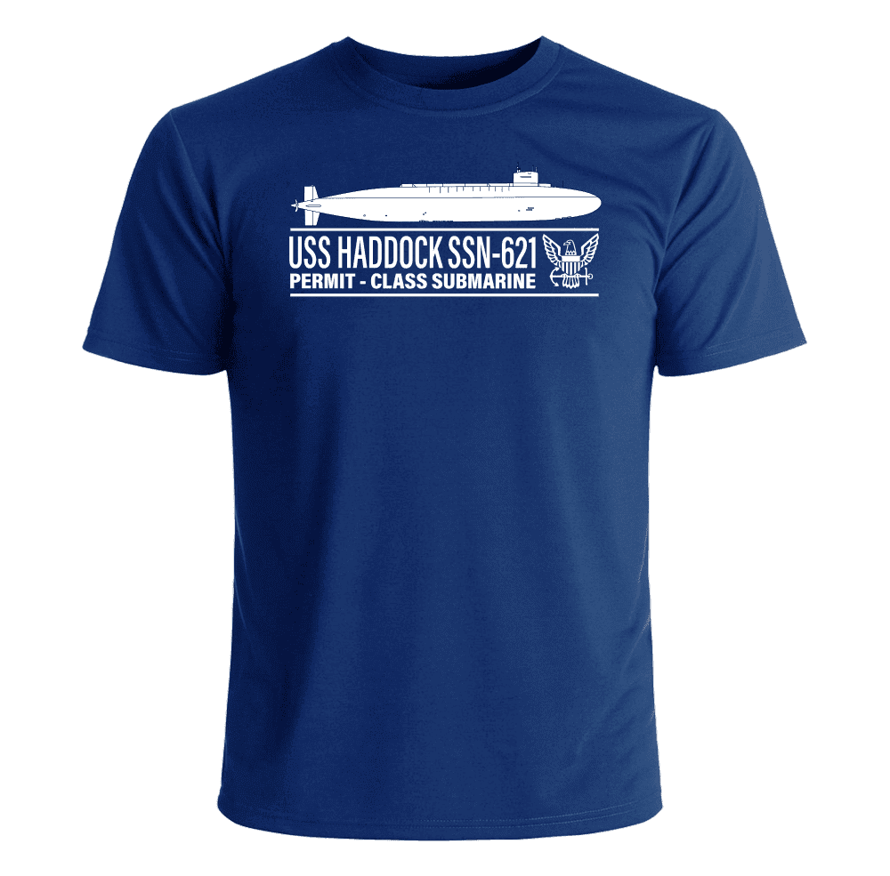 MilitaryBest is proud to offer this U.S. Navy Submarine T-Shirt. Each design is offered in Navy Blue. This fine USS Haddock SSN-621 T-Shirt is proudly printed in the USA. The quality of all of our Military products is guaranteed. Unless there is a defect in workmanship or material, these shirts are unreturnable.A percentage of the sale of each MilitaryBest item is forwarded to the licensing departments of each respective branch of service in support of the MWR (Morale, Welfare, & Recreation) program. These payments are made by either ALL4U LLC or the wholesaler from where the item originated. Our team thanks you for your service and your support of these programs.