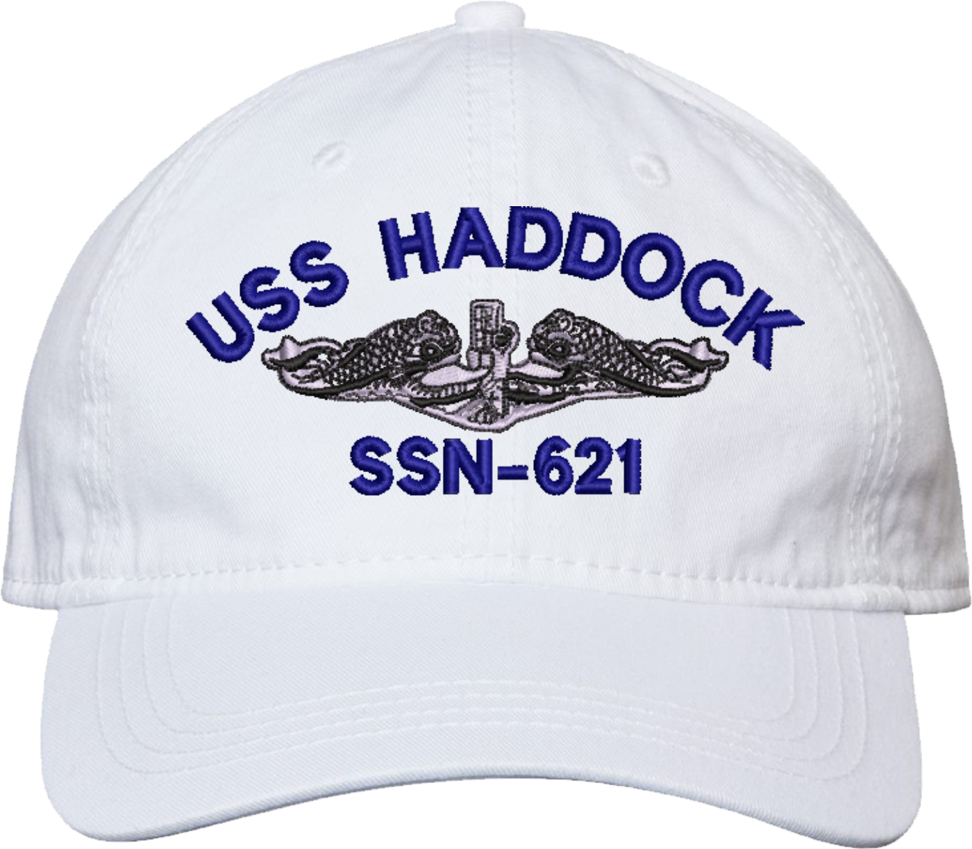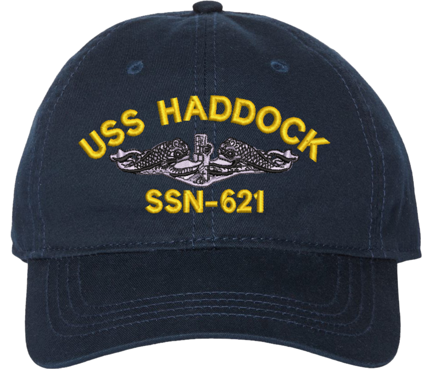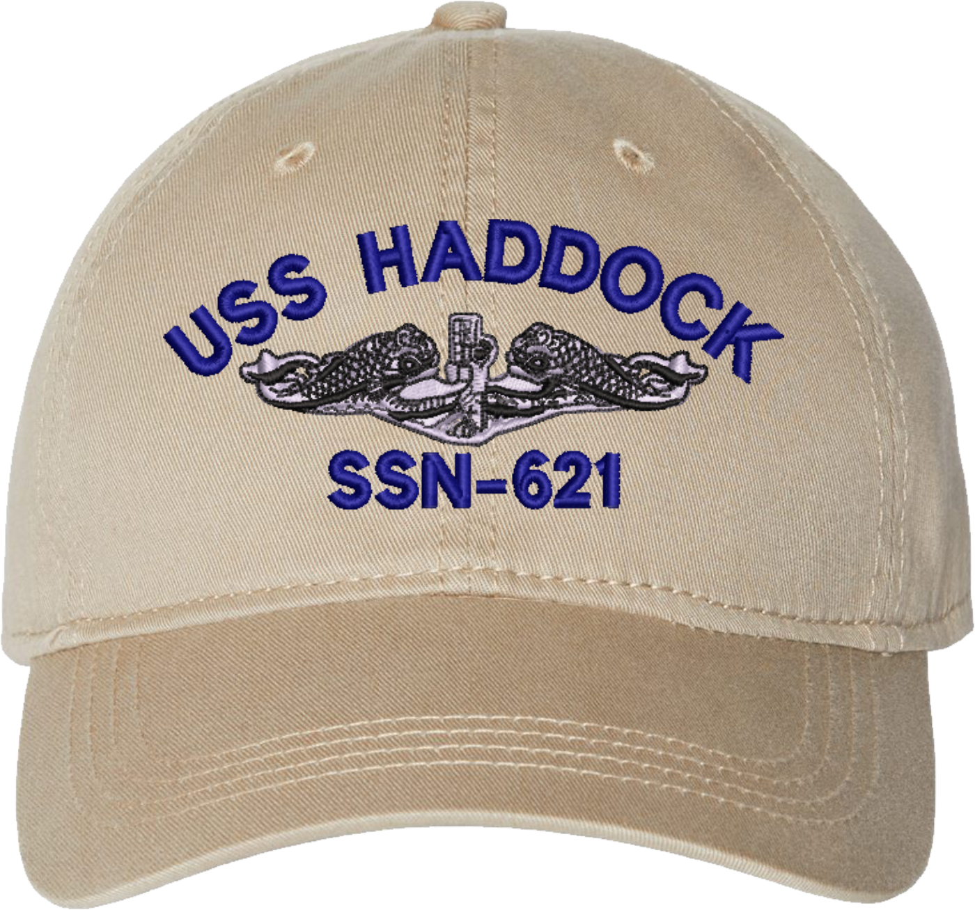 Show your Navy pride with this USS Haddock SSN-621 with Dolphins Unstructured Dad Cap from MilitaryBest. Crafted from 100% washed chino twill cotton, this six-panel, low-profile cap offers a relaxed and comfortable fit. Featuring high-quality embroidery done in our Scottsboro, Alabama facility, this cap is designed with a pre-curved visor and an adjustable tri-glide buckle closure for a perfect fit. Whether for everyday wear or as a meaningful gift, this cap is a great way to honor your own or a loved one's service.For caps ordered with custom embroidered personalized text please allow an additional 3 to 5 days production time. All custom back text will be embroidered in ALL CAPITAL LETTERS. Caps with back text or eggs are non-returnable unless there is a material defect in the cap.