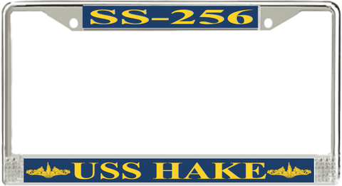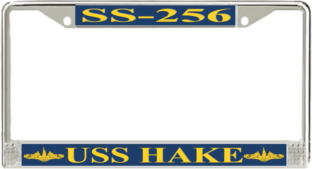USS Hake SS-256 License Plate Frame This USS Hake SS-256 License Plate Frame is proudly made in the USA at our facilities in Scottsboro, Alabama. Each Frame features top and bottom sublimated design strips that are poly coated for a protective gloss finish. Please check your state and local regulations for compatibility of these frames for use on your vehicle.