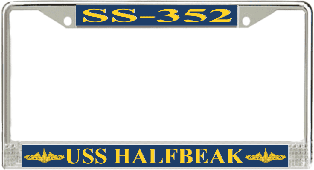 USS Halfbeak SS-352 License Plate Frame This USS Halfbeak SS-352 License Plate Frame is proudly made in the USA at our facilities in Scottsboro, Alabama. Each Frame features top and bottom sublimated design strips that are poly coated for a protective gloss finish. Please check your state and local regulations for compatibility of these frames for use on your vehicle.