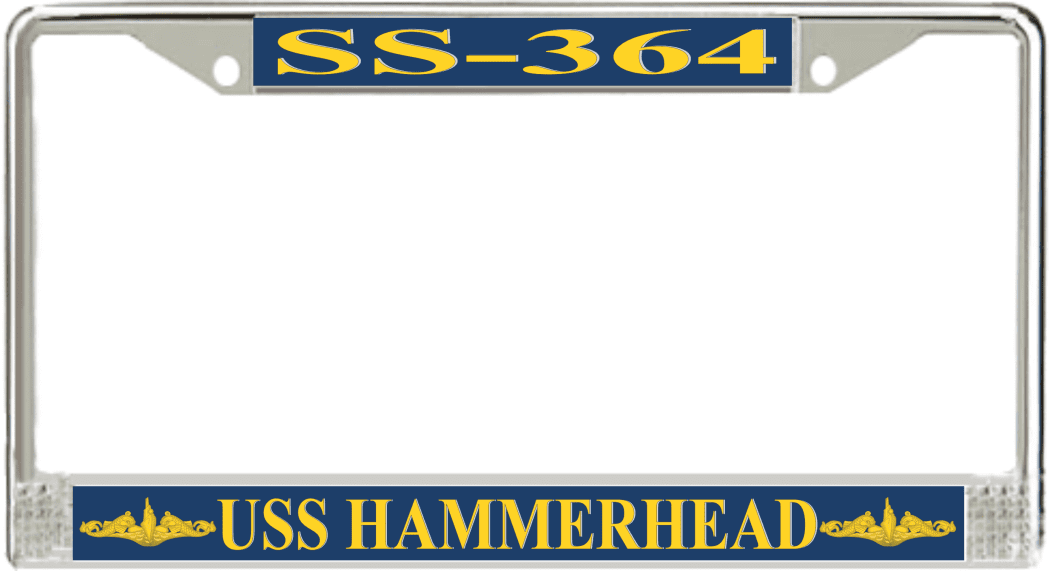 USS Hammerhead SS-364 License Plate Frame This USS Hammerhead SS-364 License Plate Frame is proudly made in the USA at our facilities in Scottsboro, Alabama. Each Frame features top and bottom sublimated design strips that are poly coated for a protective gloss finish. Please check your state and local regulations for compatibility of these frames for use on your vehicle.
