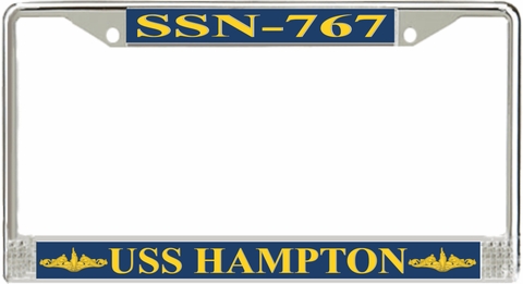 USS Hampton SSN-767 License Plate Frame This USS Hampton SSN-767 License Plate Frame is proudly made in the USA at our facilities in Scottsboro, Alabama. Each Frame features top and bottom sublimated design strips that are poly coated for a protective gloss finish. Please check your state and local regulations for compatibility of these frames for use on your vehicle.