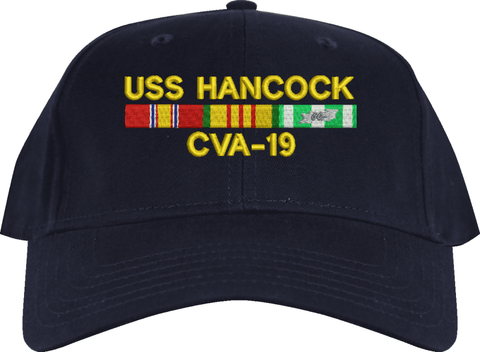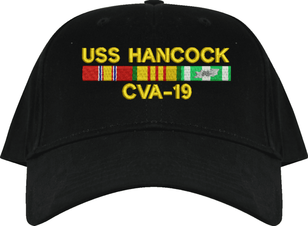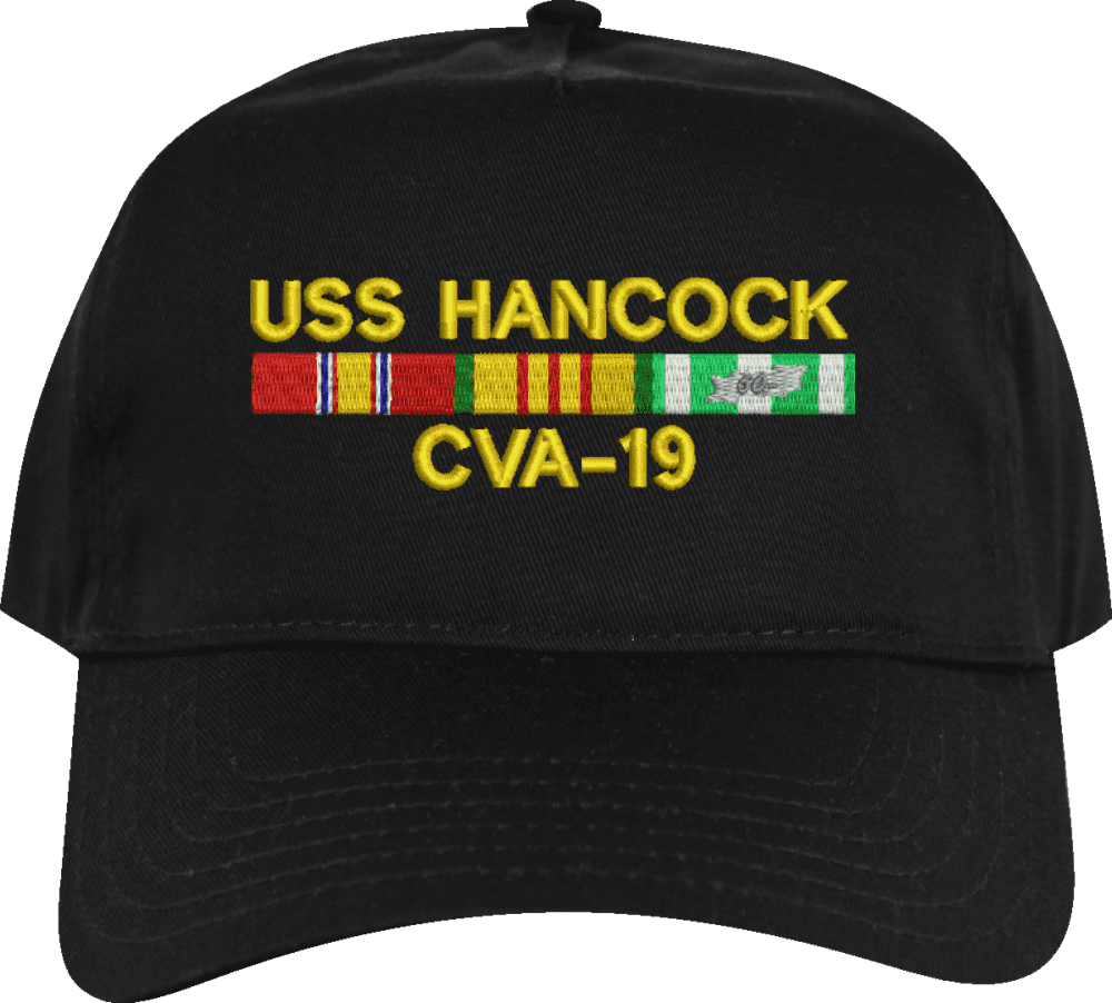 MilitaryBest is proud to offer this USS Hancock CVA-19 with Vietnam Service Ribbons Embroidered Cap. This cap is available in a 5 panel high profile or 6 panel low profile styling. All our caps are made from top quality materials. This cap would make a wonderful addition to your collection or a great gift! All custom embroidery is done at our facility in Scottsboro, AL. *Caps ordered with embroidered back text requires an additional 1 to 2 days of production time. All personalized caps will be embroidered in ALL CAPITAL LETTERS. Caps personalized with back text are not returnable unless there is a material defect in the cap.A percentage of the sale of each MilitaryBest item is forwarded to the licensing departments of each respective branch of service in support of the MWR (Morale, Welfare, & Recreation) program. These payments are made by either ALL4U LLC or the wholesaler from where the item originated. Our team thanks you for your service and your support of these programs.