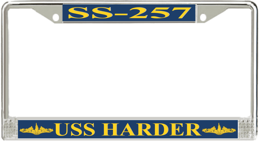 USS Harder SS-257 License Plate Frame This USS Harder SS-257 License Plate Frame is proudly made in the USA at our facilities in Scottsboro, Alabama. Each Frame features top and bottom sublimated design strips that are poly coated for a protective gloss finish. Please check your state and local regulations for compatibility of these frames for use on your vehicle.