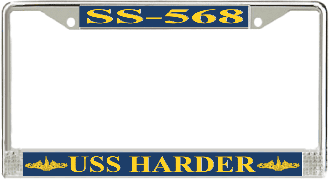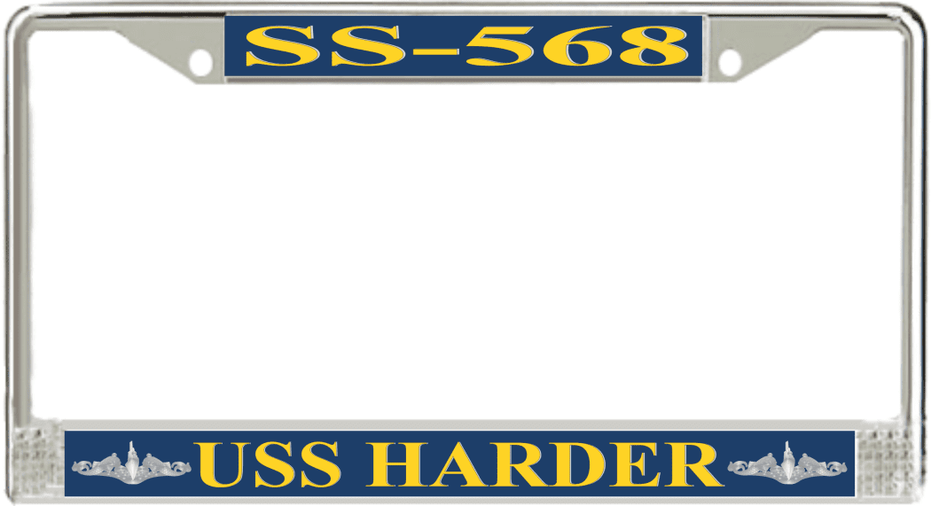 USS Harder SS-568 License Plate Frame This USS Harder SS-568 License Plate Frame is proudly made in the USA at our facilities in Scottsboro, Alabama. Each Frame features top and bottom sublimated design strips that are poly coated for a protective gloss finish. Please check your state and local regulations for compatibility of these frames for use on your vehicle.