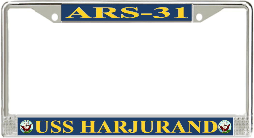 USS Harjurand ARS-31 License Plate FrameThis USS Harjurand ARS-31 License Plate Frame is proudly made in the USA at our facilities in Scottsboro, Alabama. Each of our MilitaryBest U.S. Navy Frames feature top and bottom Poly Coated Aluminum strips that are printed using sublimation which gives these quality automobile military frames a beautiful high gloss finish.